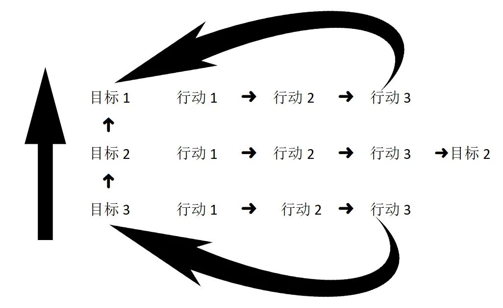 做到目标3后,再去做目标2里的行动1,行动2,行动3,就自然能达成目标2,直至实现最终目标。