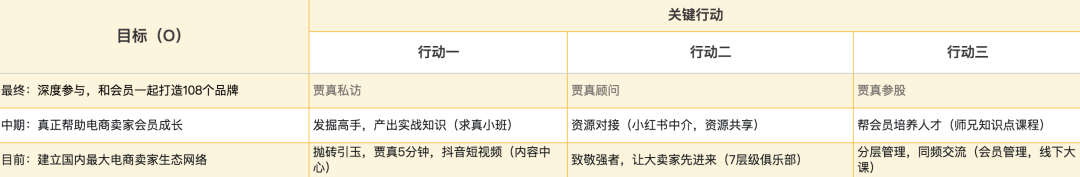 大家可以参考一下我做贾真108将的okr,终局是:深度参与,和会员一起打造108个电商品牌。