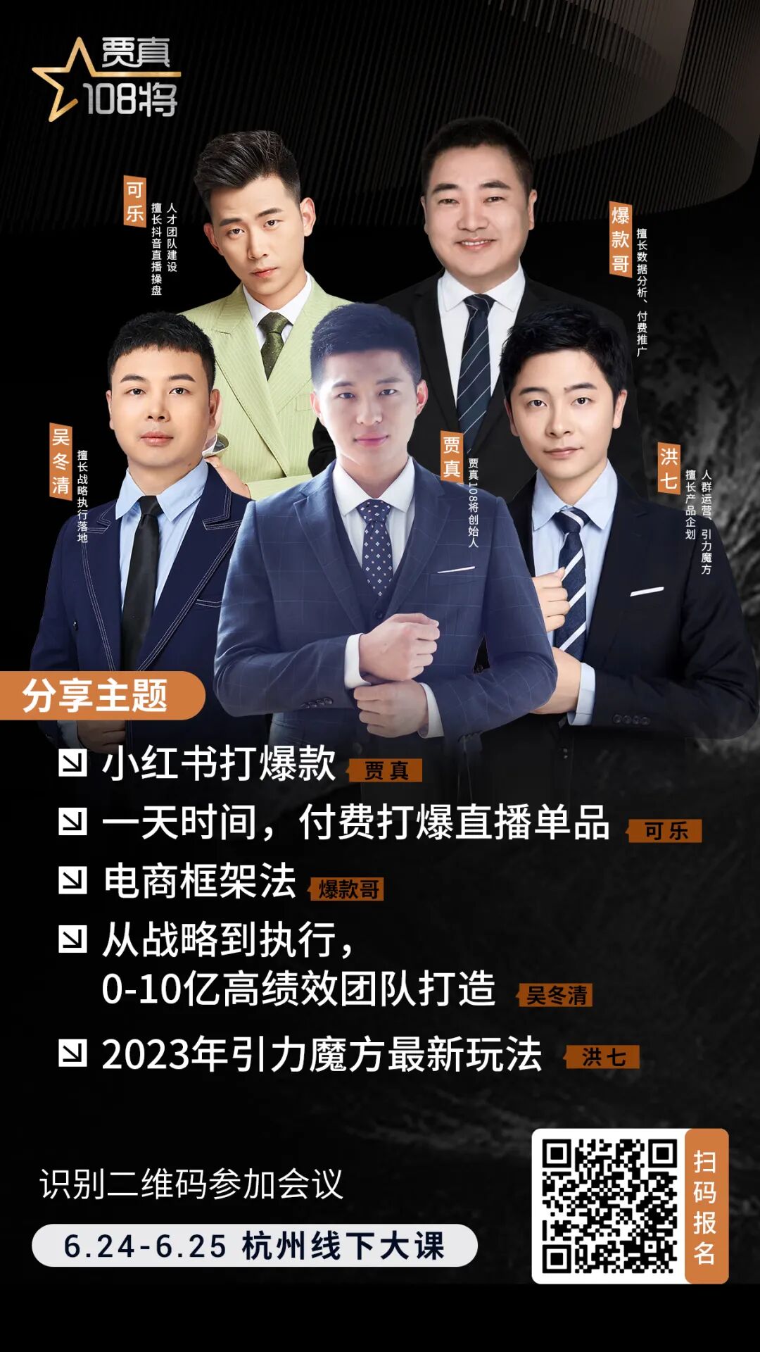 108将杭州线下大课,内容包括贾真半天大课,淘系付费玩法,小红书打爆款、抖音直播带货,公司团队管理,主题夜谈。