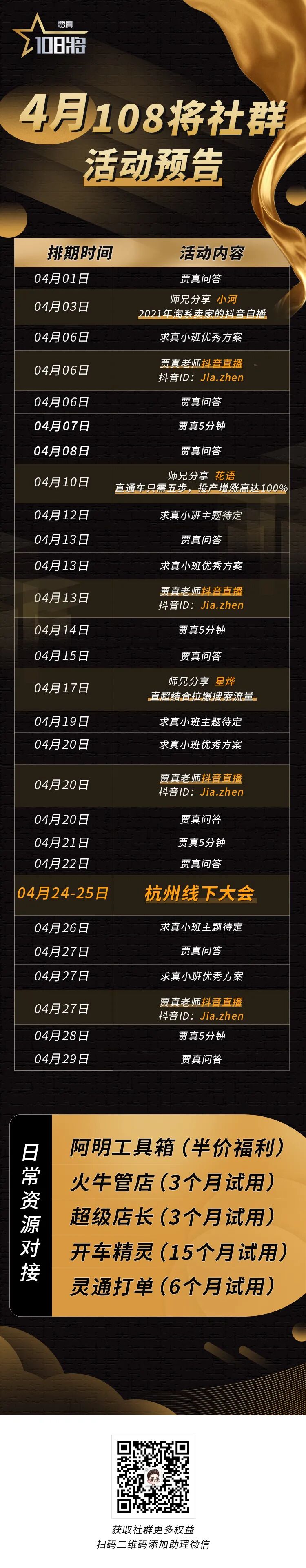 4月贾真108将社群排期已出,活动福利多多,大家有兴趣可以加海报上班主任二维码。