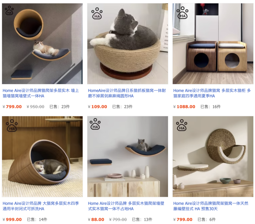 比如我们宠物家具最早的热销款,是设计师风格的,现在我们整个店铺改名:Home Aire猫角落 设计师品牌。