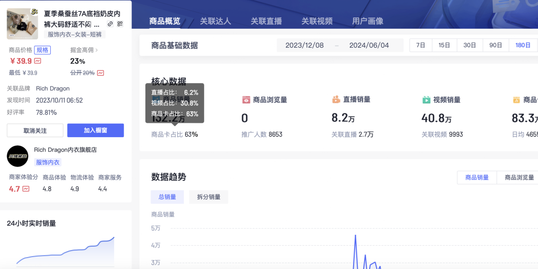 半年5000万的链接,成长过程是,商家设置了相对高的佣金,短视频先起来的,造了个词“奶皮内裤”。